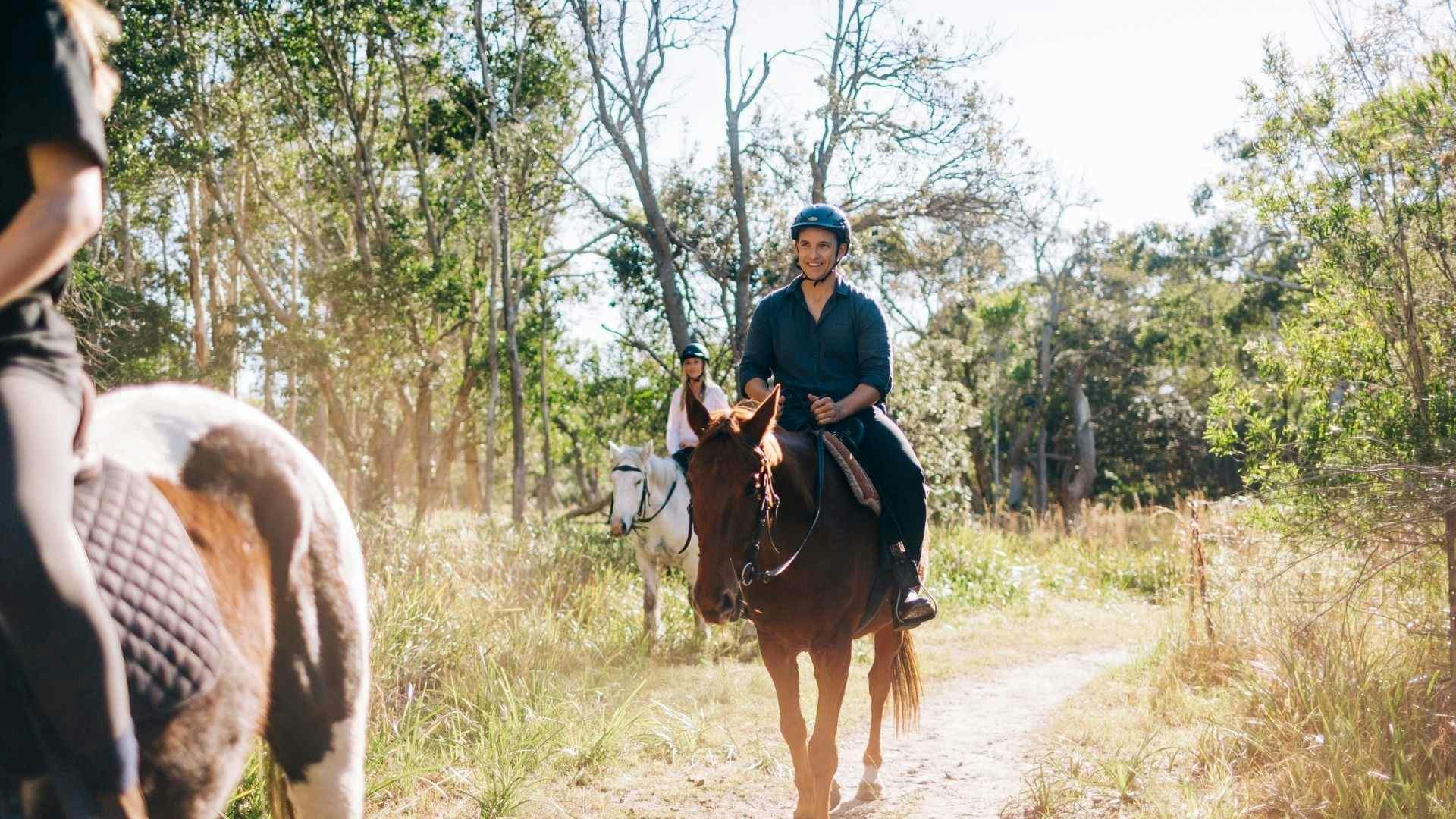 Couple enjoying a horse-riding experience near Tyagarah Beach with Zephyr Horses in Byron Bay Credit: Destination NSW
