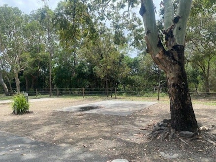 Powered double site with concrete slab. You can enjoy full use of the camper's kitchen, BBQs, amenities block, coin-operated laundry, swimming pool and courts.