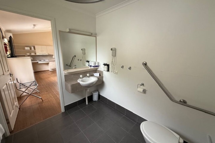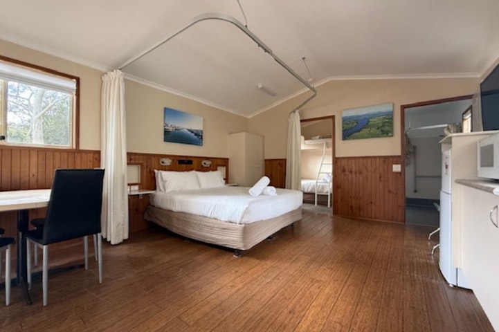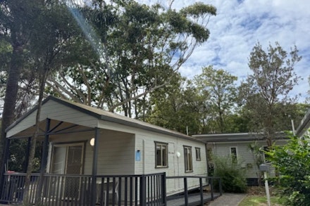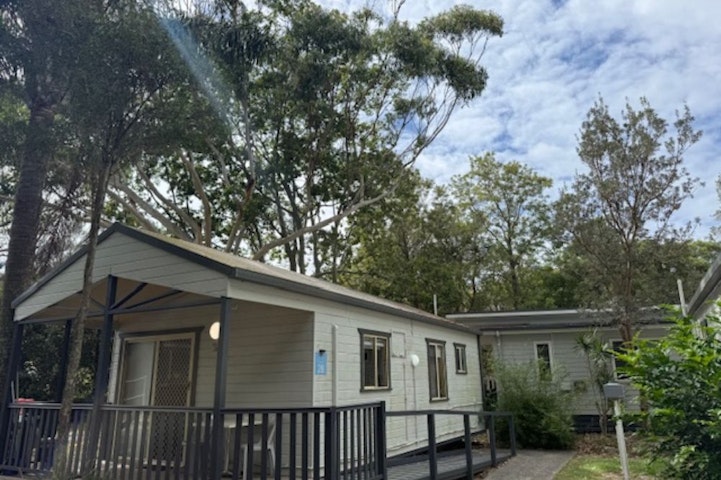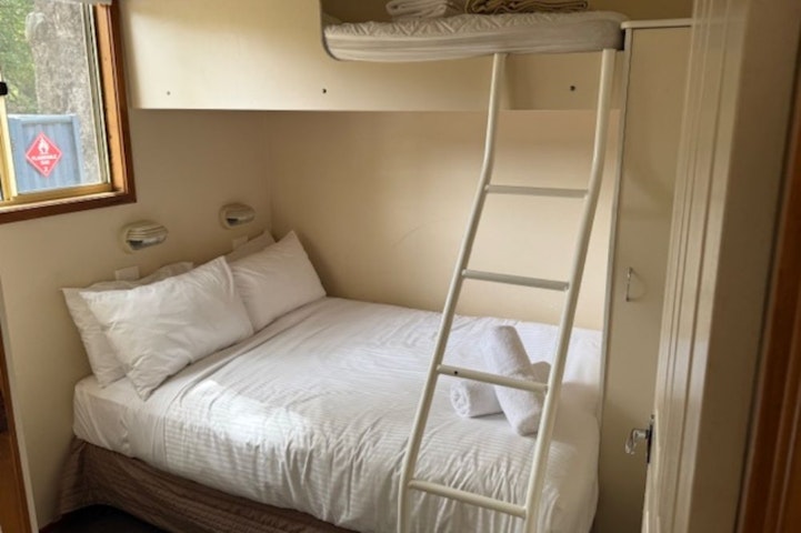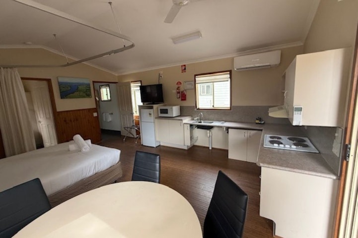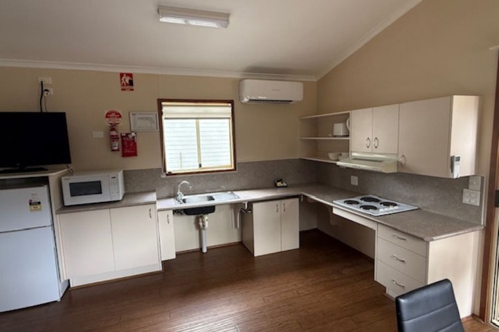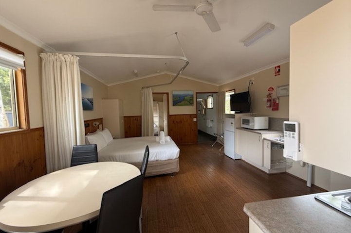 The cabin includes an accessible bathroom with a disabled-friendly shower and toilet, along with a functional kitchen fitted with lower benches, a fridge, microwave and stovetop for easy meal preparation. Guests can relax with a TV and reverse-cycle air-conditioning to keep the cabin comfortable year-round.