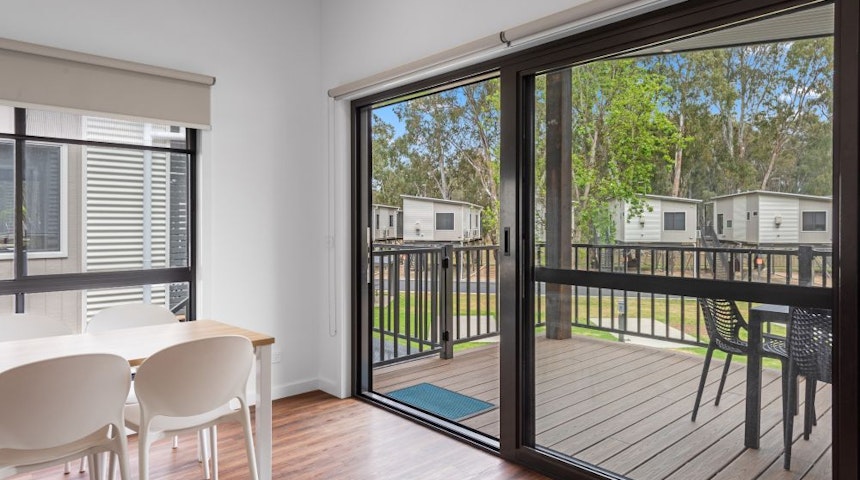 The Deluxe Cabin has two bedrooms with a lounge and dining area, bathroom and a full kitchen.