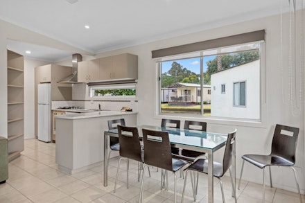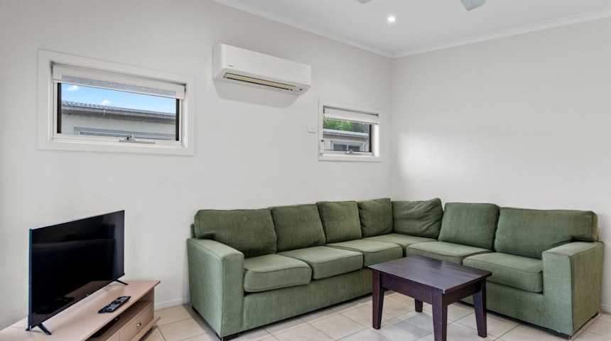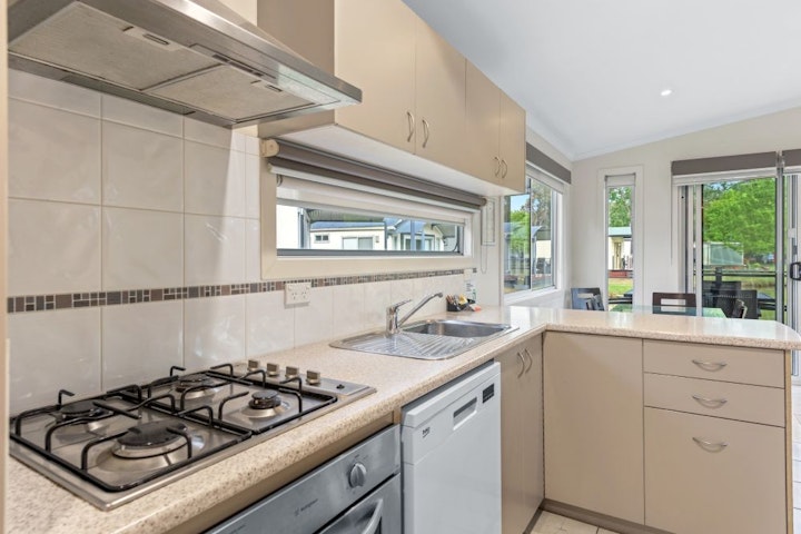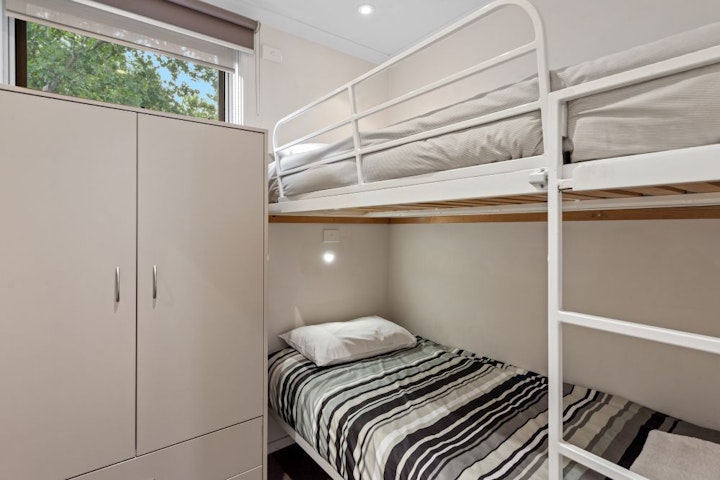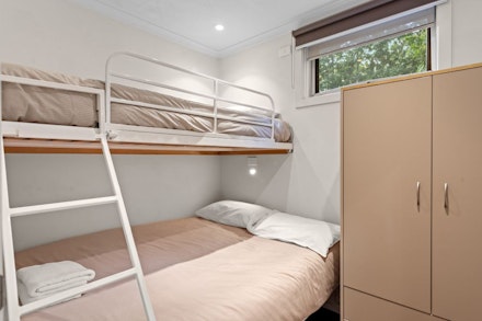 The Deluxe Cabin has three bedrooms with a lounge and dining area, ensuite and a full kitchen.
