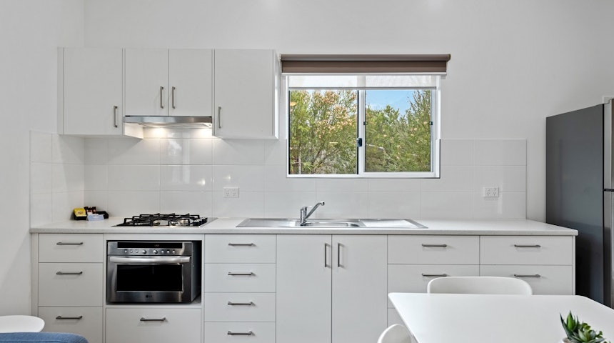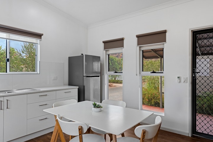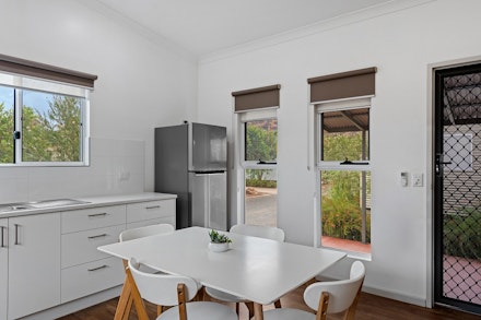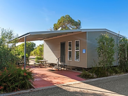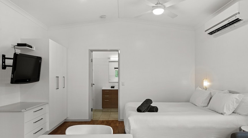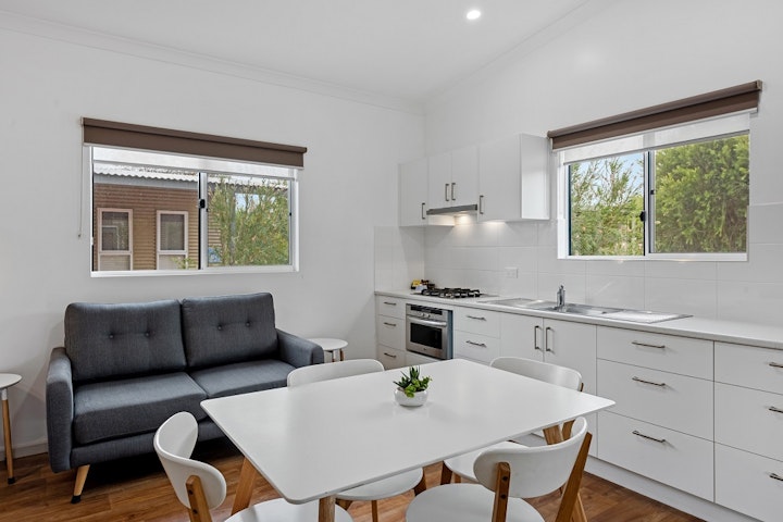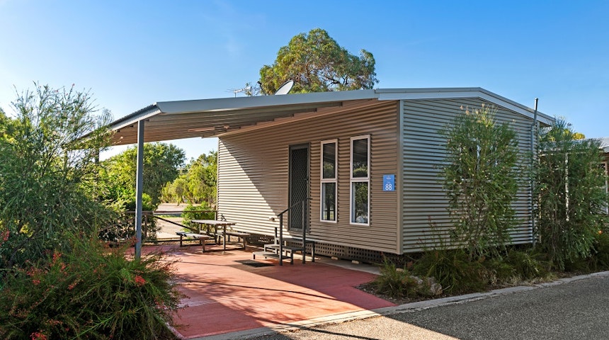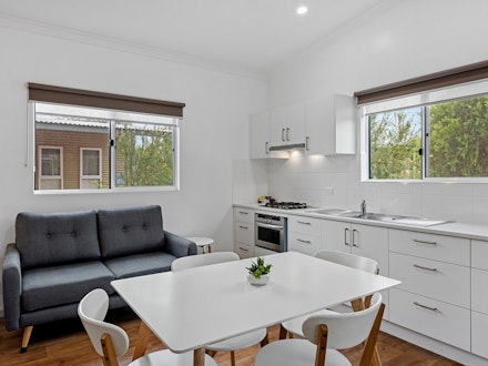 Self-contained cabins with an open-plan living space. Our spacious Studio Cabins are perfect for couples wanting room to relax with a queen bed, open plan living area and modern bathroom. There is a full length carport and outdoor setting. All linen is supplied including bath and pool towels Self-contained cabins with an open-plan living space.