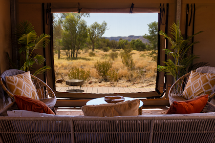 Luxurious camping nestled in the Red Centre. Wake up with peaceful singing from the crested bellbird to a day of adventure and end your day in our glamping-style accommodation with all the hotel embellishments you could need. These premium canvas tents have been designed to blend in with the beautiful Northern Territory landscape. Each luxurious tent features comfortable beds with premium linen, a modern lounge area, dining space, outdoor deck with seating, split air-conditioning system and a private ensuite bathroom stocked with Australian-made skin care products. Bookings in our Glamping Tent includes daily buffet breakfast.