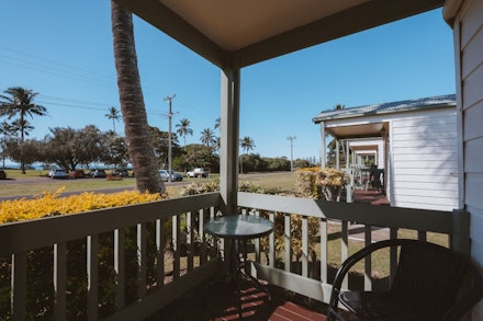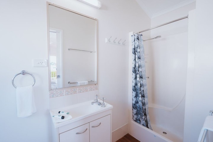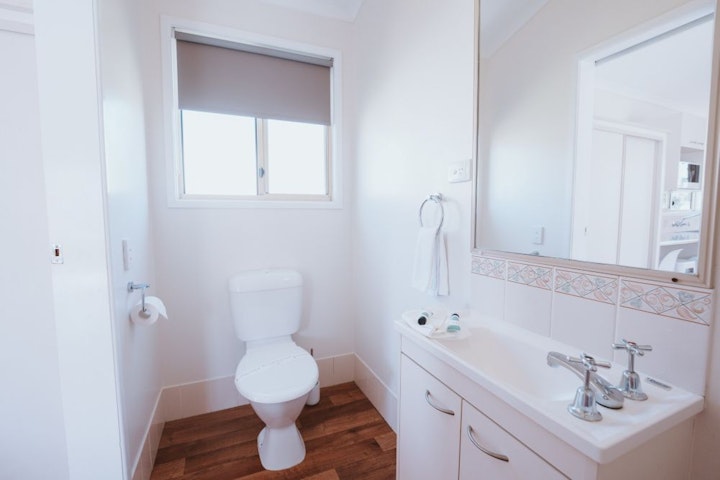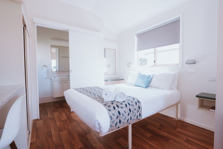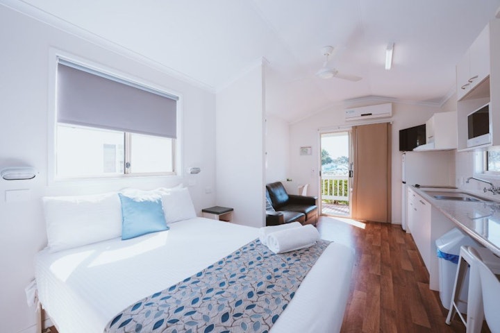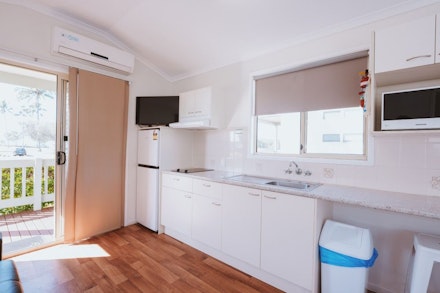 This open-plan cabin features a double bed and a double sofa bed. Enjoy a self-contained kitchen with all essentials, a cosy dining area, and a living space with a TV. The bathroom includes a shower, toilet, and vanity, and the cabin is air-conditioned for your comfort.
