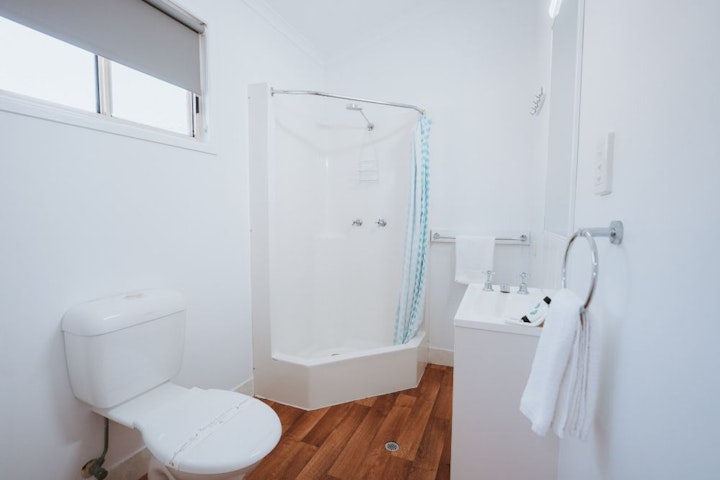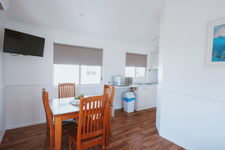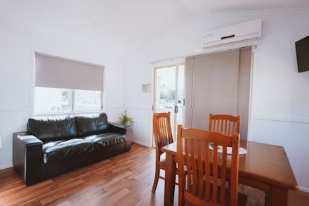 This open-plan space features a queen bed, double bed, and double sofa bed. Enjoy a self-contained kitchen with all essentials, a cosy dining area, and a living space with a TV. The bathroom includes a shower, toilet, and vanity, and the cabin is air-conditioned for your comfort.