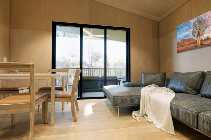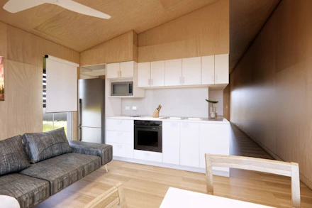 Designed for up to 4 guests, this accessible cabin offers 2 bedrooms: a main bedroom with a queen bed and a second bedroom with 2 single ensemble beds. The kitchen features a cooktop, oven, microwave, and full-size fridge. A private bathroom with shower, reverse-cycle air conditioning, and a spacious deck ensure a comfortable stay for all guests.