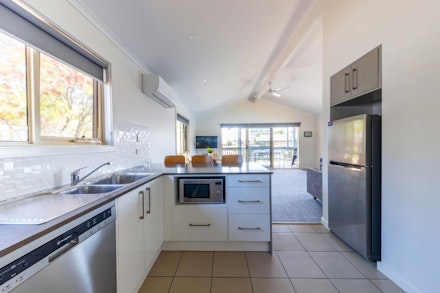Sally the Seahorse’s Cabins are a newly renovated option, offering a perfect space for guests seeking comfort and quality time together. Each cabin includes a fully equipped kitchen, a spacious lounge area, and a private deck with an outdoor setting, allowing guests to fully immerse themselves in the relaxing atmosphere of the Holiday Park.