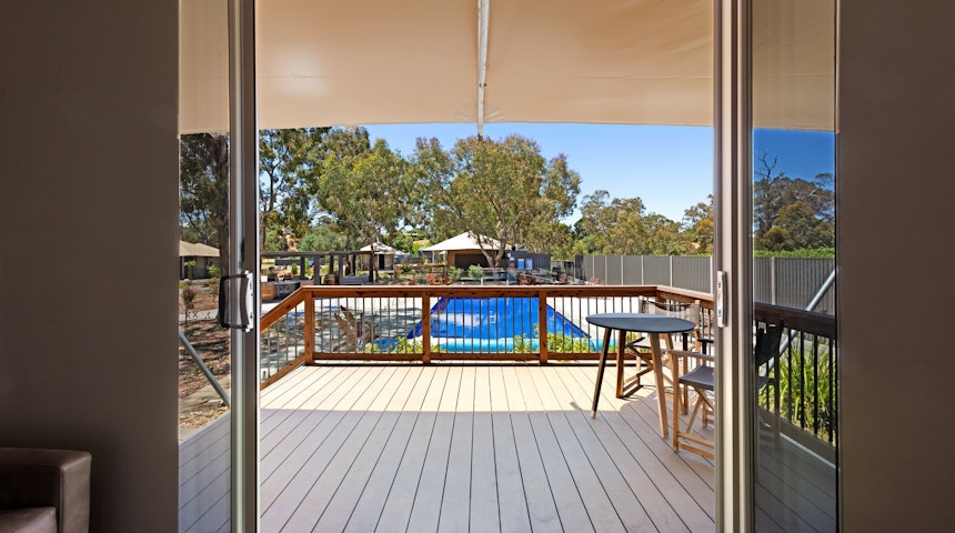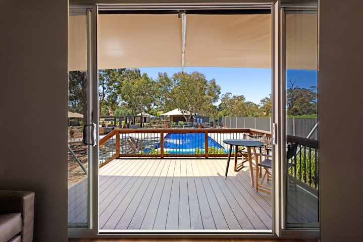 *18+ ONLY* Nestled within a private area of the park, your eco-friendly safari tent is set amongst native gums, with vineyard views as far as the eye can see. Sharing a private swimming pool and premium BBQ and lounge area, it is the ultimate place to unwind and embrace lavish comfort. Each tent has been meticulously designed to be environmentally sustainable and features an ensuite bathroom, kitchenette, and spacious bedroom configured with either a king-sized or twin bedding.