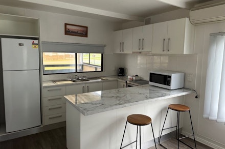 Spacious cabin with a semi-enclosed verandah for extra privacy, spacious kitchen, modern appliances. A relaxing space to stay while you explore the very best of Coffin Bay.