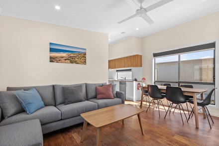 Fully self-contained with its own galley-style kitchen and modern bathroom, a spacious dining/living area opens onto a private outdoor deck with furniture setting perfect for breakfast or an afternoon catch up.