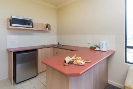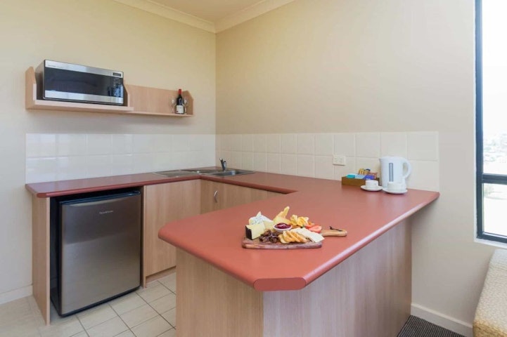 The room features 1 x King Bed, an ensuite with a spa bath, and a small kitchenette with microwave, electric frypan, toaster and cooking utensils - ideal for light self-catering. A flat-screen TV and tea-and-coffee-making facilities are provided, and room service is available on request. Please note lower-level kitchenette rooms are accessed via stairways