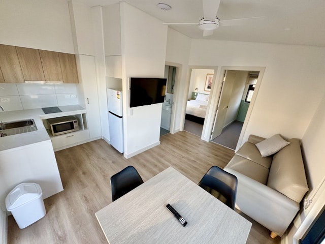 - Open-plan living with dining space and TV