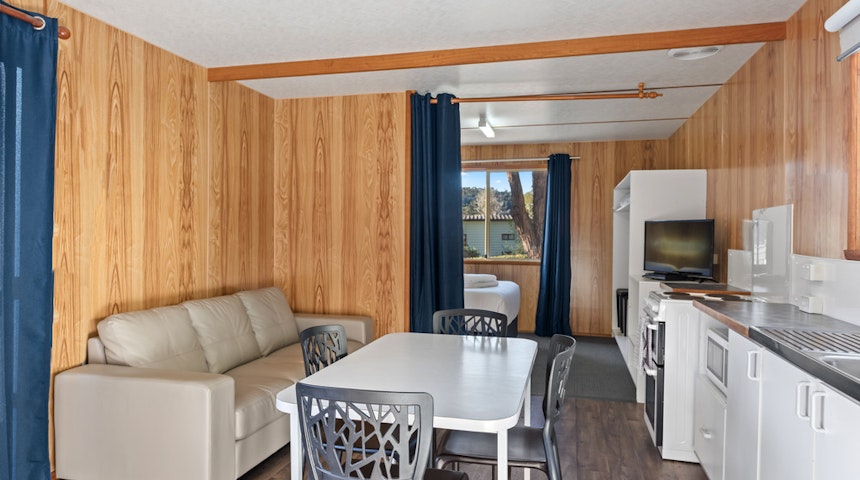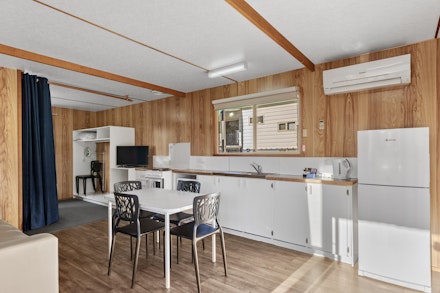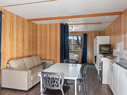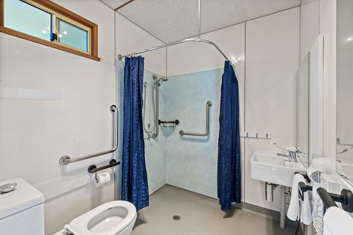 Our comfortable cabins are fully self-contained, sleep 6 and have a large fridge in a well-equipped kitchen. Designed for reduced mobility access.
