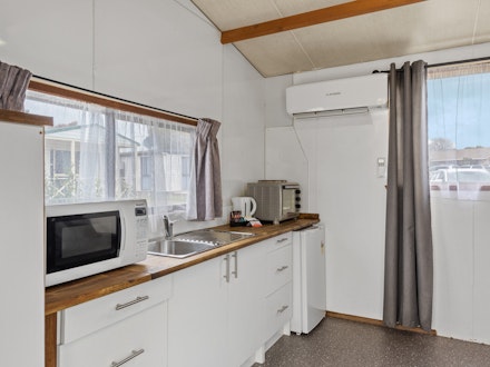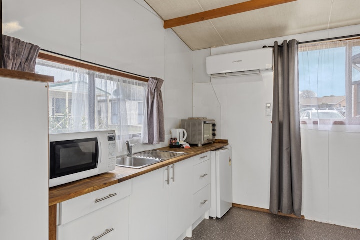 - Kitchenette with electric stove/hot plate, microwave, bar fridge, kettel, toaster, cookware, cooking utensiles and cutlery