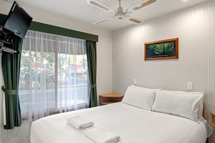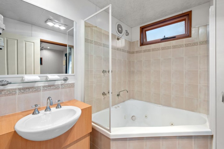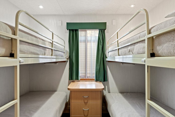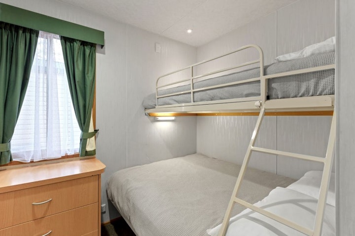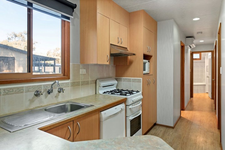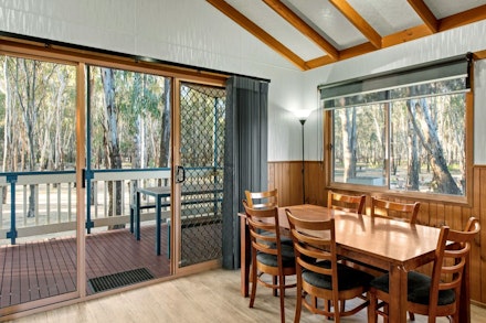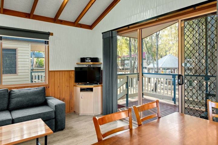 The Deluxe Spa Cabin has three bedrooms with a lounge and dining area, two bathrooms (one with corner spa) and a full kitchen. Sleeps 9 (Maximum 6 adults)