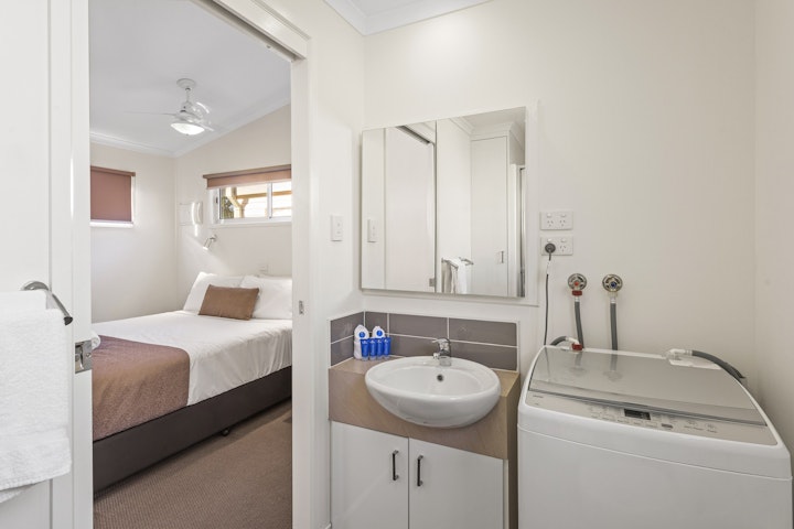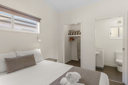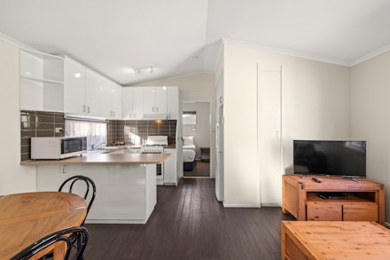 The Deluxe Cabin has one bedroom with a lounge and dining area, ensuite and a full kitchen.