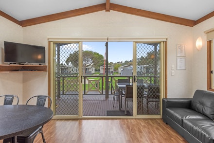 The Standard 2 Bedroom Cabin has two bedrooms with a lounge and dining area, ensuite and a full kitchen. Disability pets permitted - must call park first to book.