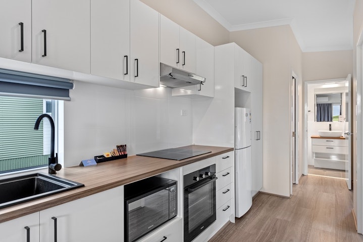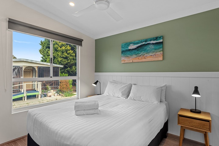 The Deluxe 2 Bedroom Cabin has two bedrooms with a lounge and dining area, bathroom and kitchen.