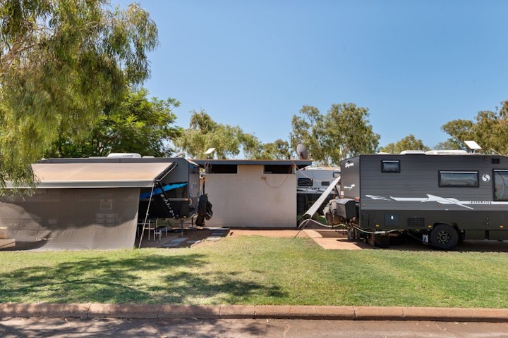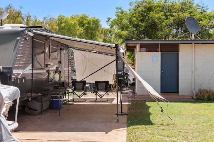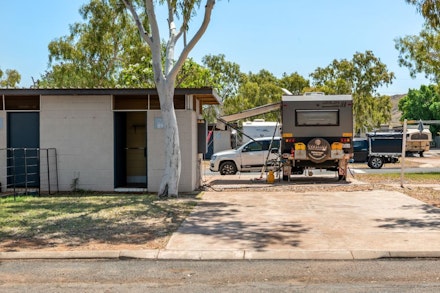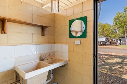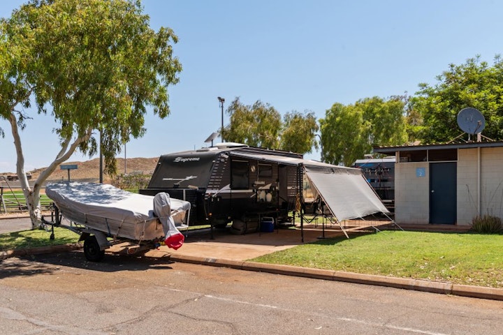 The Ensuite Powered Site has a shower, toilet and hand basin for the exclusive use of the site. The site has a level concrete slab for the van or motor home and annex. Each site has its own individual power, water and sullage connections. NB: Please be advised that Karratha can experience cyclones. Please ensure you use a cyclone “Tie down Kit” to secure your tent and/or caravan