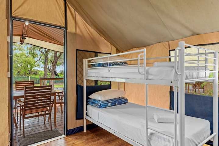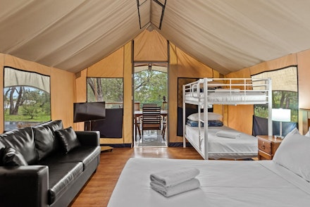 Enjoy time away in our Superior Safari Tents. Combine the fun of camping with the comforts of a cabin, and remove the worries of setting up and packing away a tent; what more could you want in a holiday? Superior Safari Tents are an open plan design with a queen bed + set of bunk beds (2 singles), sofa, TV, self-contained kitchenette, private ensuite bathroom and outdoor sheltered dining area.
