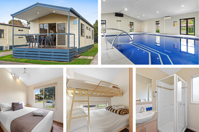 Ensuite Powered and Unpowered Grass Sites are also available and all guests get access to the indoor heated Swimming Pool, BBQs, Camp Kitchen and Playground.
