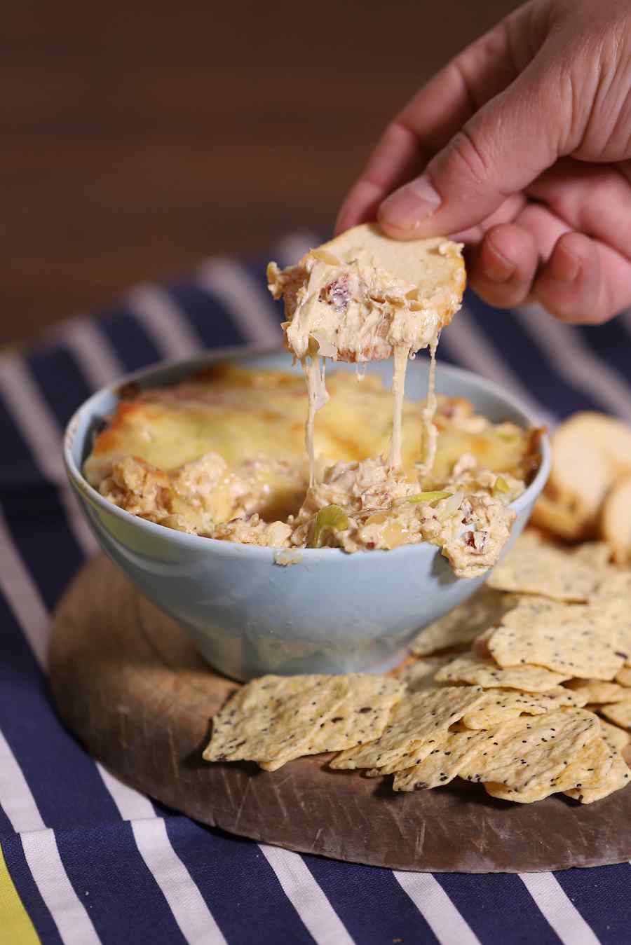 Mix the cream cheese, sour cream and Cheddar together. Add the bacon, garlic and spring onions, mix to combine.